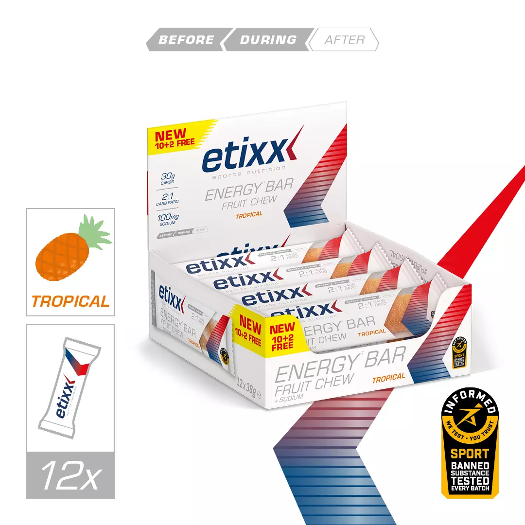 Batonul energetic Etixx cu fructe conține 30 g de carbohidrați într-un raport optim de 2:1 (glucoză:fructoză) pentru o absorbție optimă a carbohidraților. În plus, conține și 100 mg de sodiu per baton.